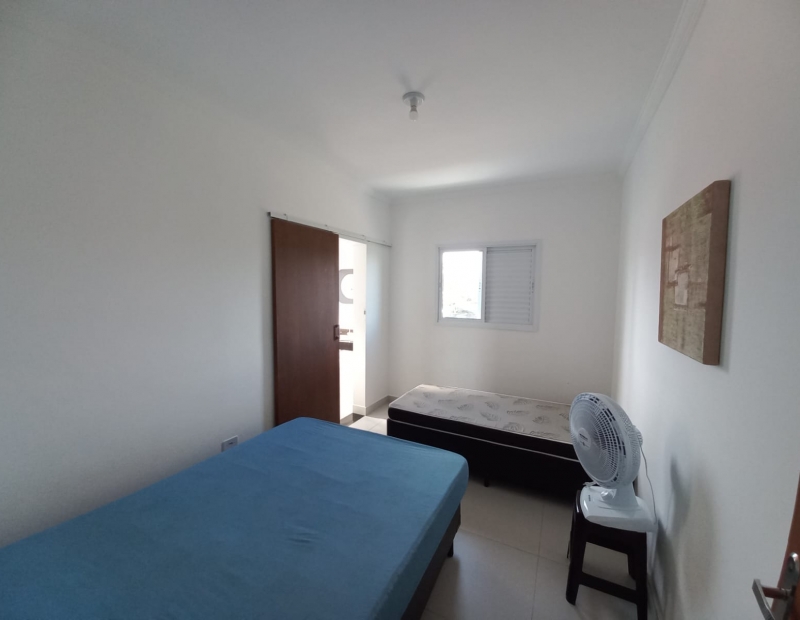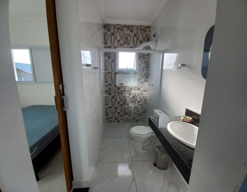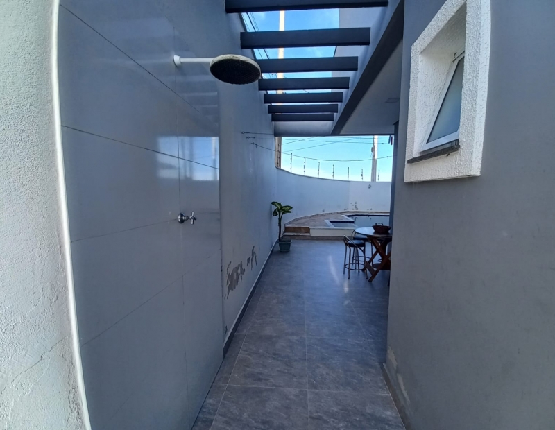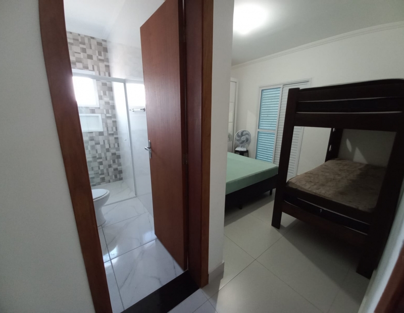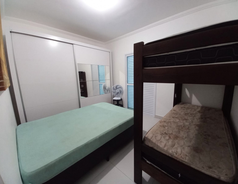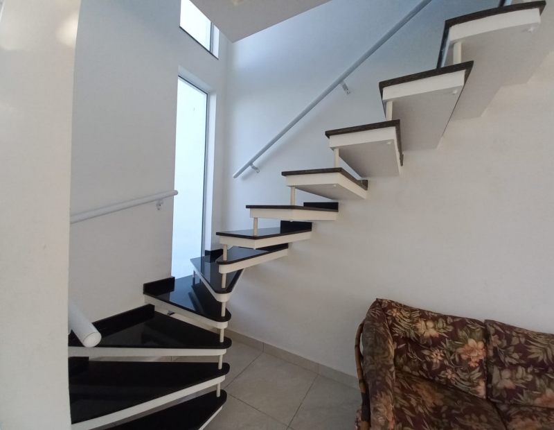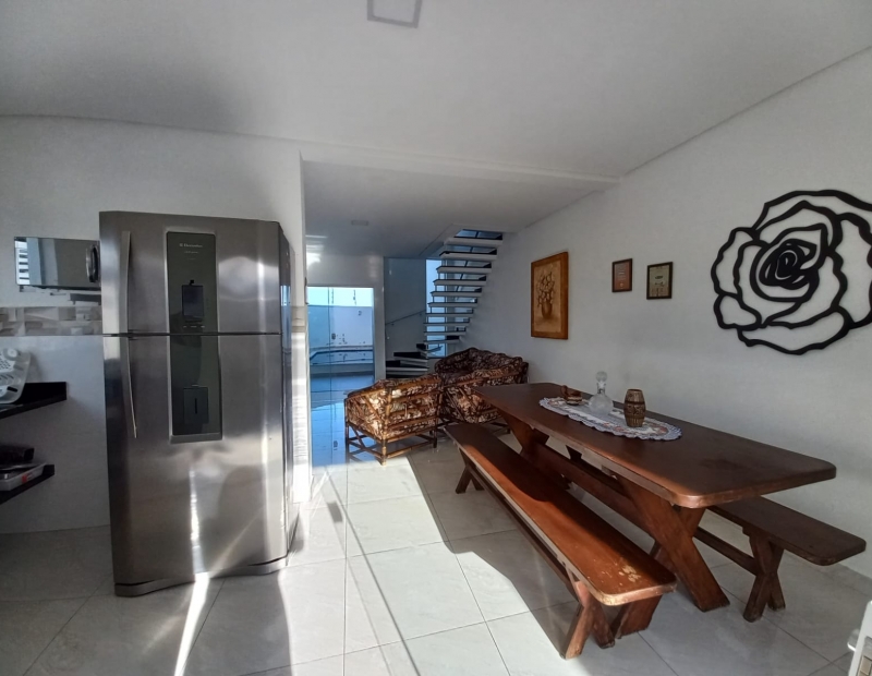 No piso superior são 3 dormitórios, sendo 1 suíte com sacada e vista para o mar.