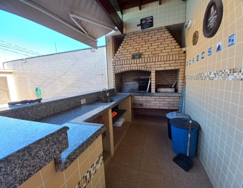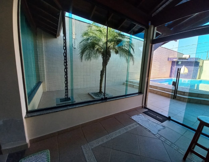 Linda piscina e área gourmet coberta.