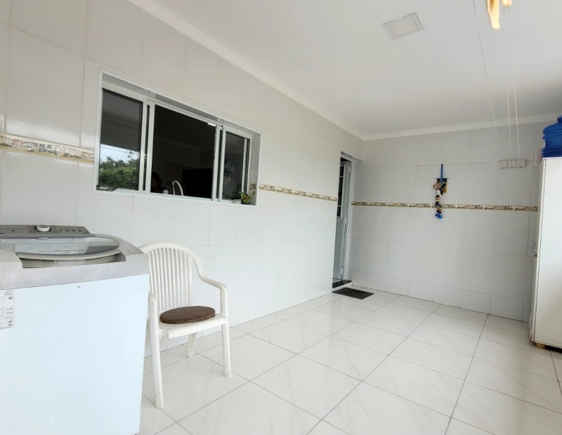 Área de serviço coberta, churrasqueira, piscina com cascata e WC externo