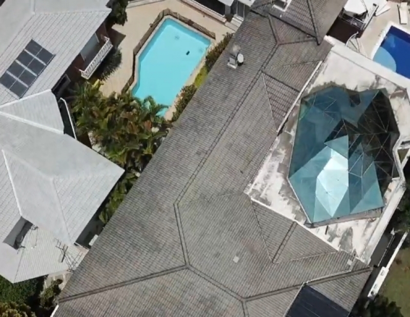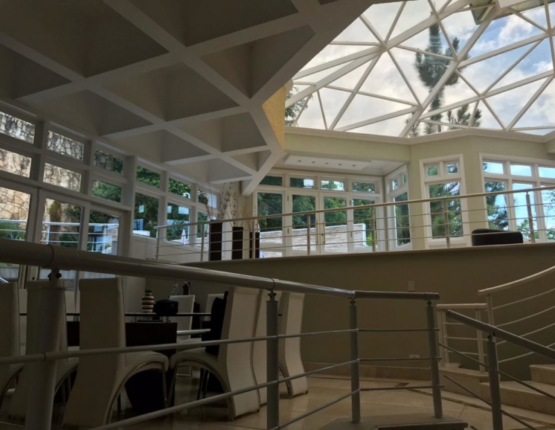 Acima da área de estar existe uma cúpula de vidro com arquitetura impressionante. Área de jantar anexa e acesso ao piso superior, o que confere a toda a moradia uma iluminação natural.