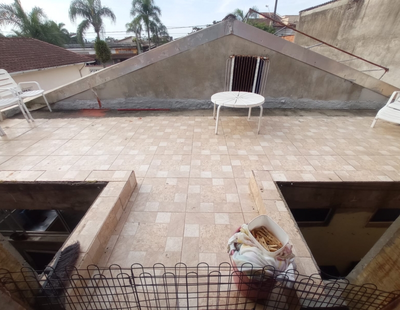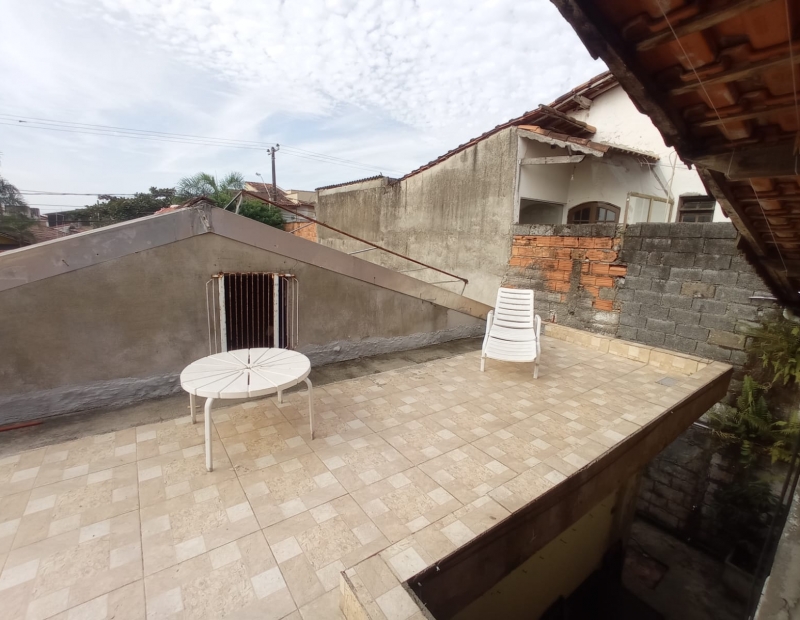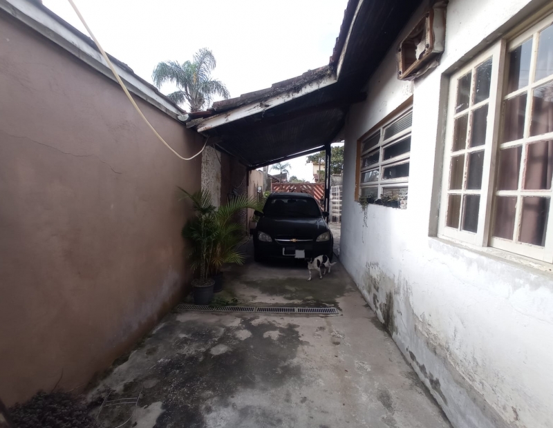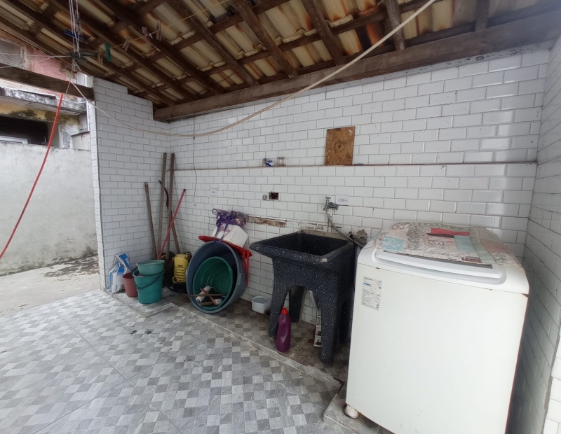 Quintal com garagem para cerca de 3 veículos e área de serviço coberta.